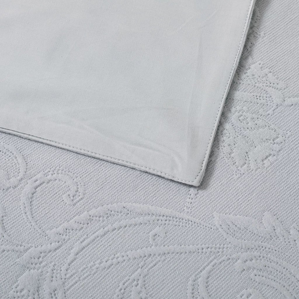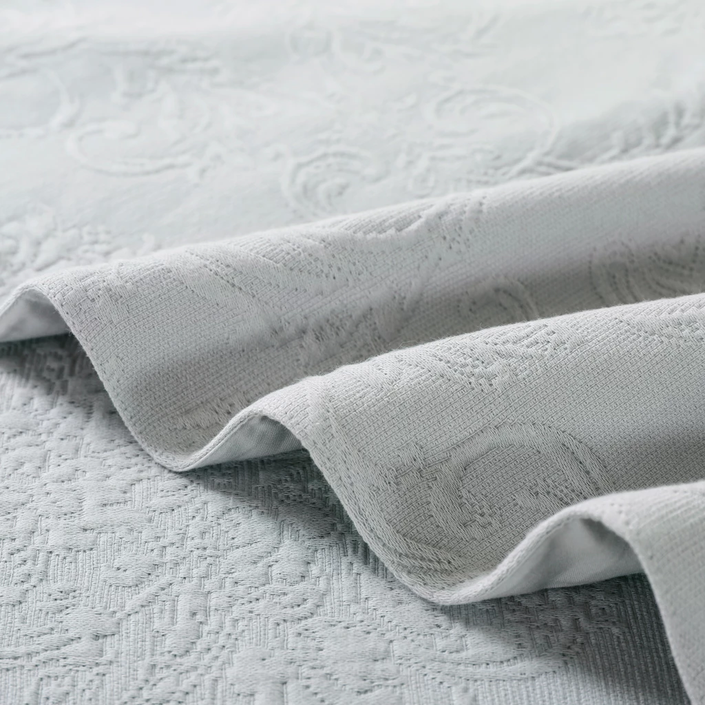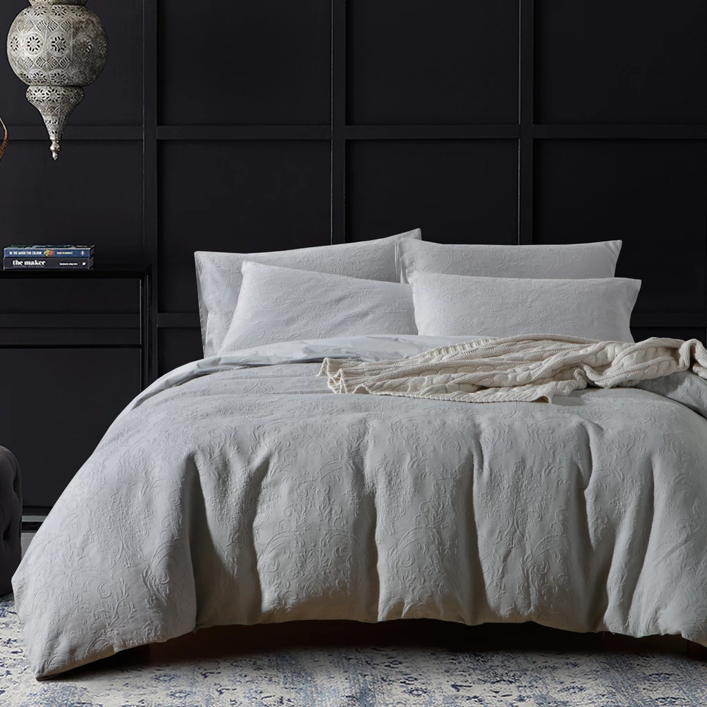 Our Aria Grey duvet cover set is a light weight matelassé woven with a textured damask motif. The light grey color is today’s new neutral that blends with most color schemes. It is backed to our classic pre-washed percale which boasts a soft hand feel. The cover is elegant and dressy and can elevate the look of any bedroom. Pair it with Smoke 400 egyptian cotton sheets and Rich Grey velvet cushions for a calming effect, or add more colorful accents from our Velvet cushion collection to lift your décor. Aria has a hidden zippered side opening for ease of care. It is machine washable and dryable at cold temperatures.