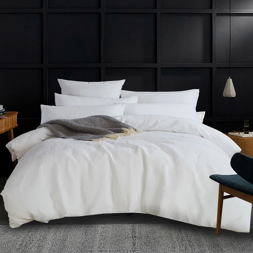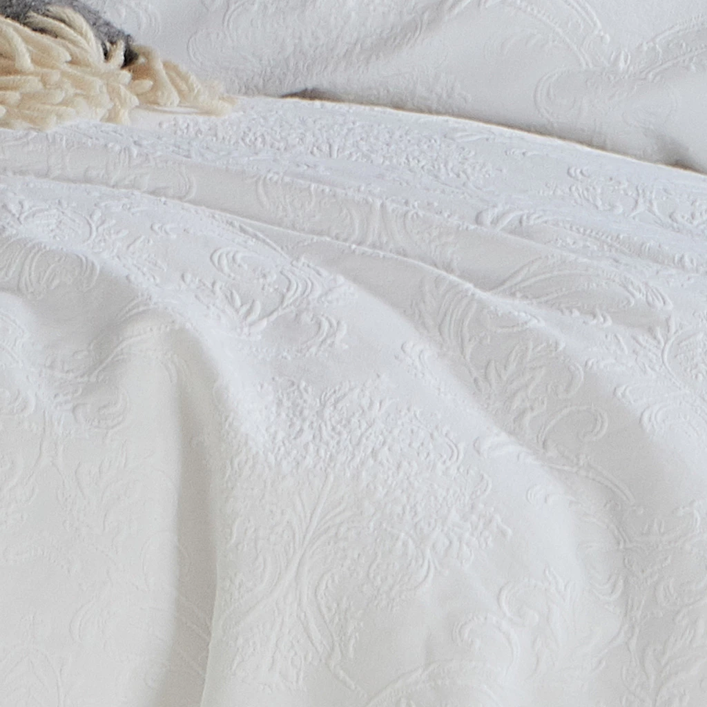 Our Aria White duvet cover set is a light weight matelassé woven with a textured damask motif. It is backed to our classic pre-washed percale which boasts a soft hand feel. The cover is elegant and dressy and can elevate the look of any bedroom. Pair it with white sheets and white cushions for a calming effect, or add colorful accents from our Velvet cushion collection to lift your décor. Aria has a hidden zippered side opening for ease of care. It is machine washable and dryable at cold temperatures.