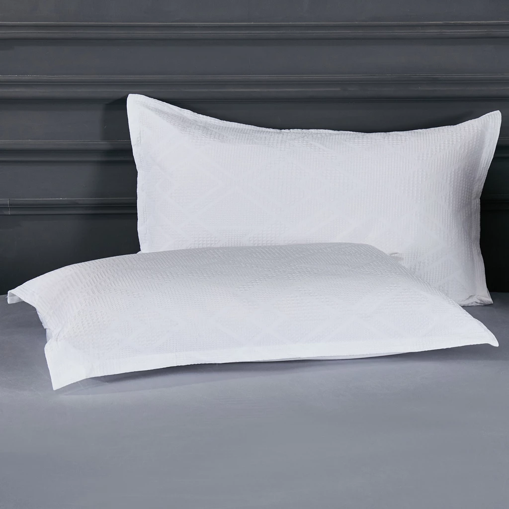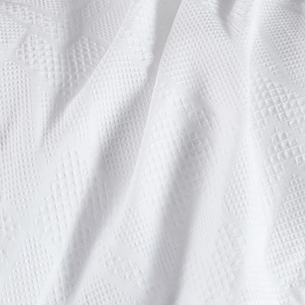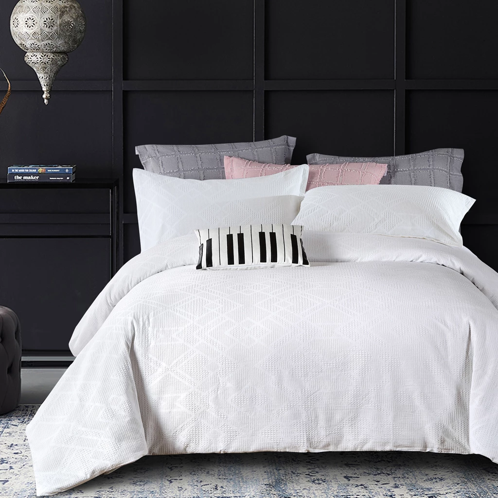 Modernize your décor with Fairmont, our fresh white duvet cover set woven in a 100% cotton geometric waffle, reversing to a solid white 300 count cotton sateen. It can be paired with any of our 400 count Egyptian cotton sheets and Dutch velvet cushions to add color to your room. Alternatively match it to our Cloud White Egyptian sheets for a crisp clean finish. The set is machine washable for ease of care; plus inside corner ties on the duvet cover ensure your duvet stays in place.