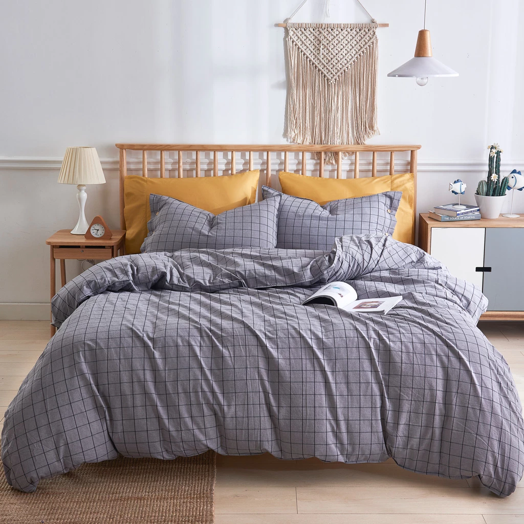 Oxford is a yarn dyed design woven with black windowpane checks on a grey background. The simple modern style will accommodate many settings from cottage to condo and beyond. The set is made of 100% combed cotton for breathability and comfort. Machine washable and dryable for ease of care. The pillow covers have a decorative wood button closure. The duvet cover has a 60” zipper opening along one side and interior corner ties to keep the duvet in place.