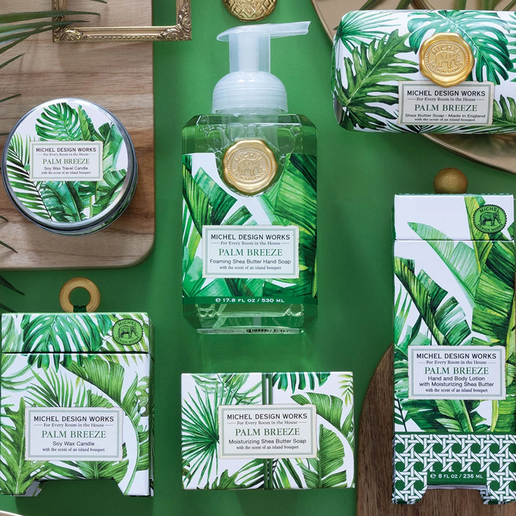The scent of Palm Breeze brings up tropical marine greenery touched with peach, sandalwood, and melon. The vibrant greens and feathery fronds of our Palm Breeze design bring to mind a fresh tropical feel.