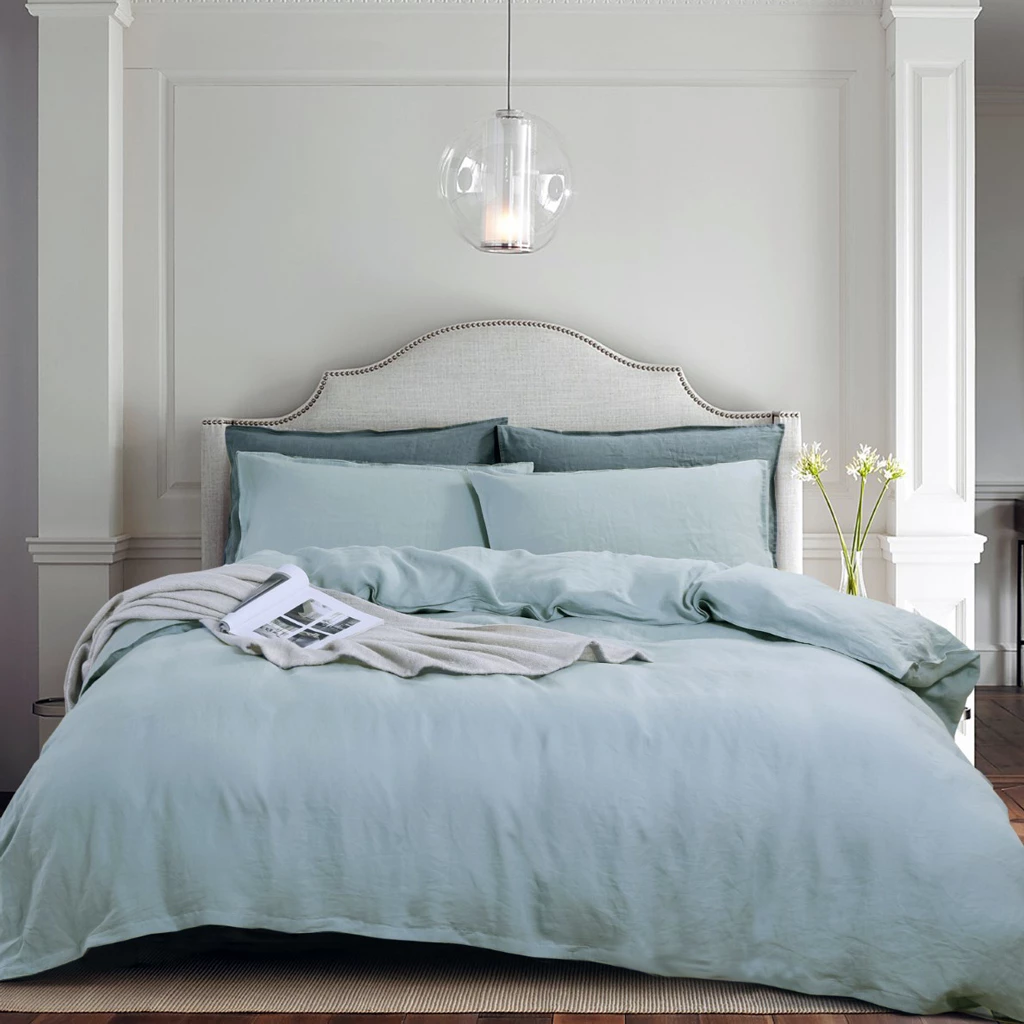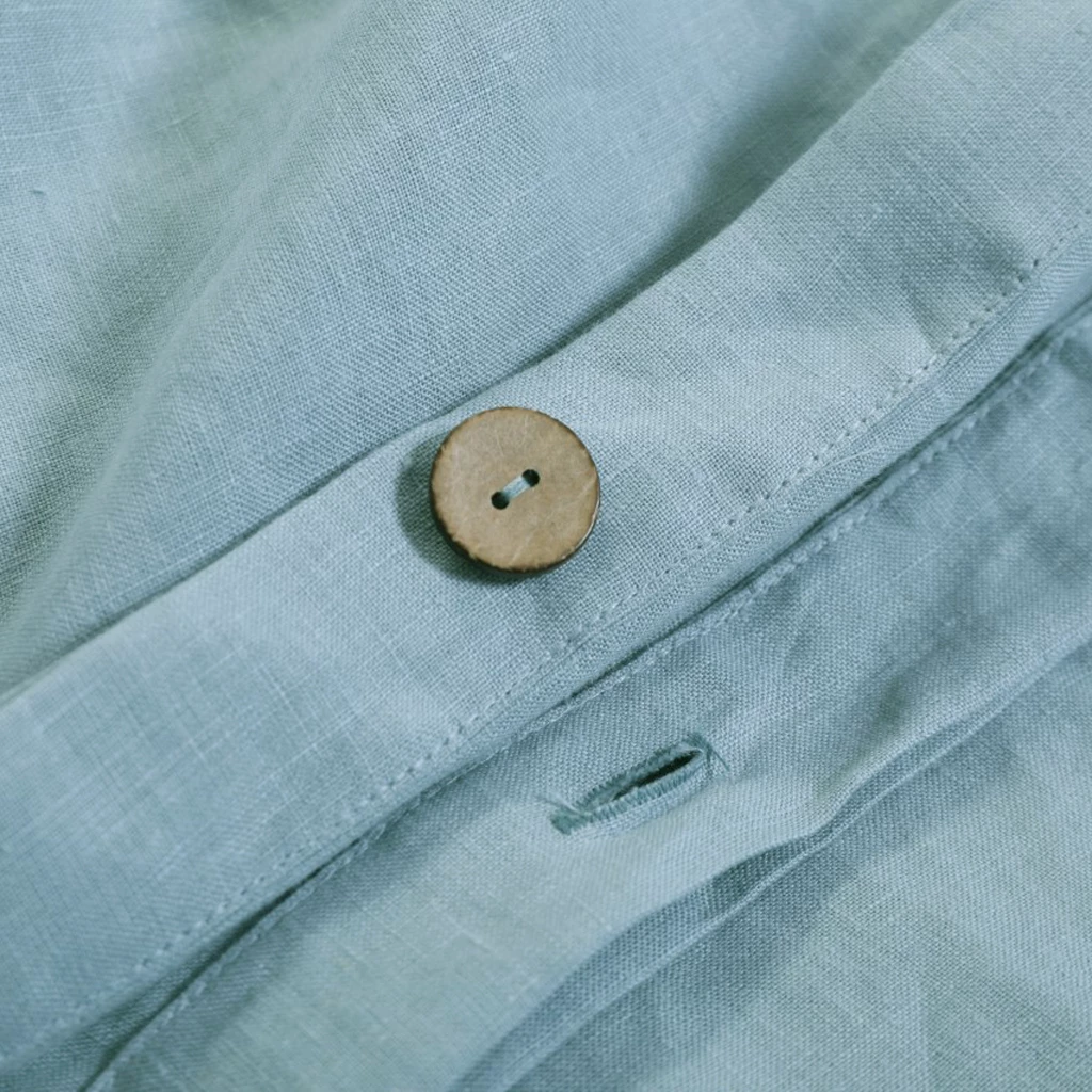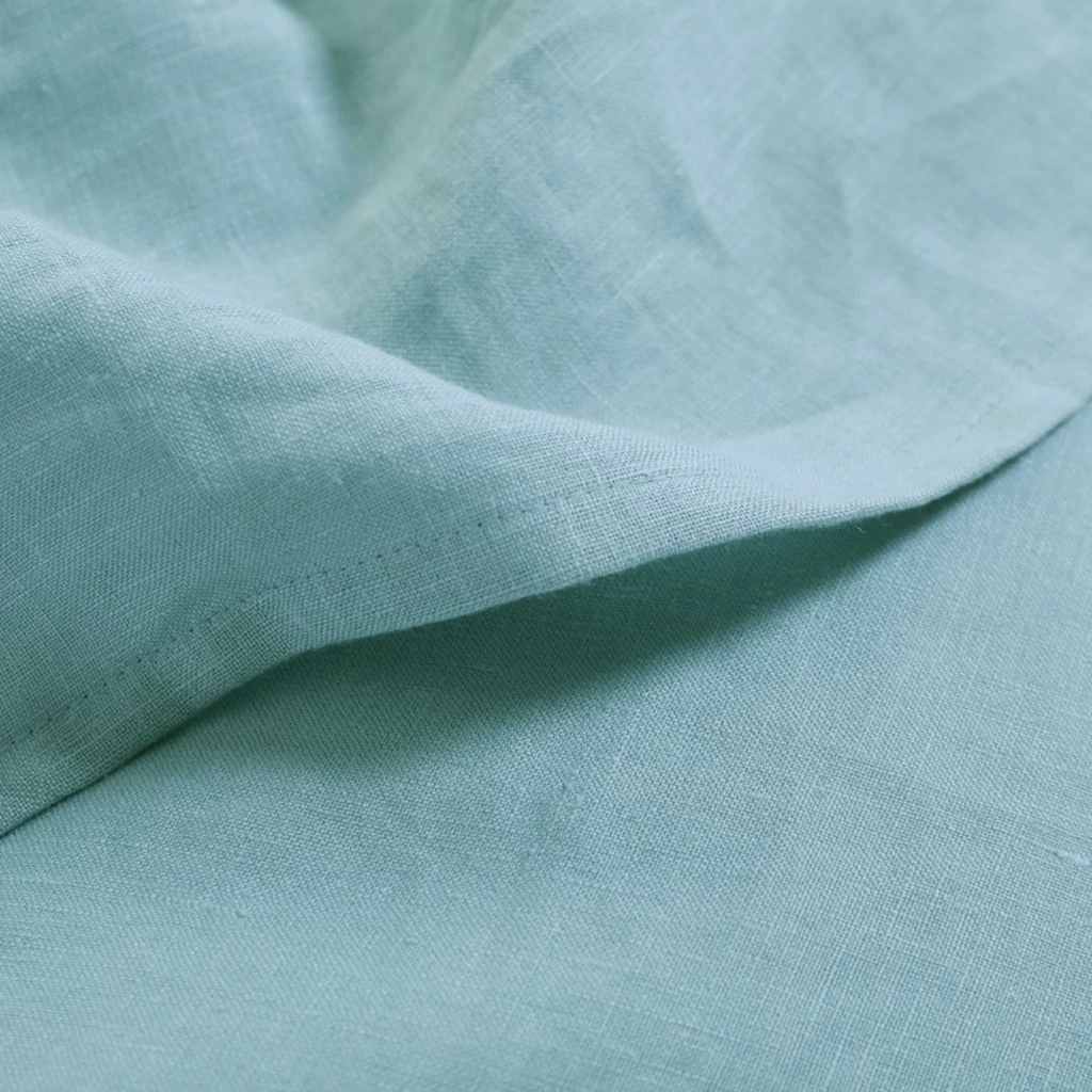 Our Soft Aqua linen duvet cover set is dyed a perfect shade of aqua adding color and elegance to your room. Our linen, originally sourced from France, is prewashed making it extra soft and giving you that natural “lived-in” look. Take it straight from the dryer to the bed, no extra ironing or pressing required. Our quality is in the details. The duvet covers are sewn with a heavy hidden button placket at the end of the bed serving to not only hide the button closure, but to provide a substantial finish to the bottom of the cover. The pillowcases are sewn with a generous housewife tuck so your pillows never peek out. Finally, the set is finished with a double stitched edge giving it a polished, tailored look.Â