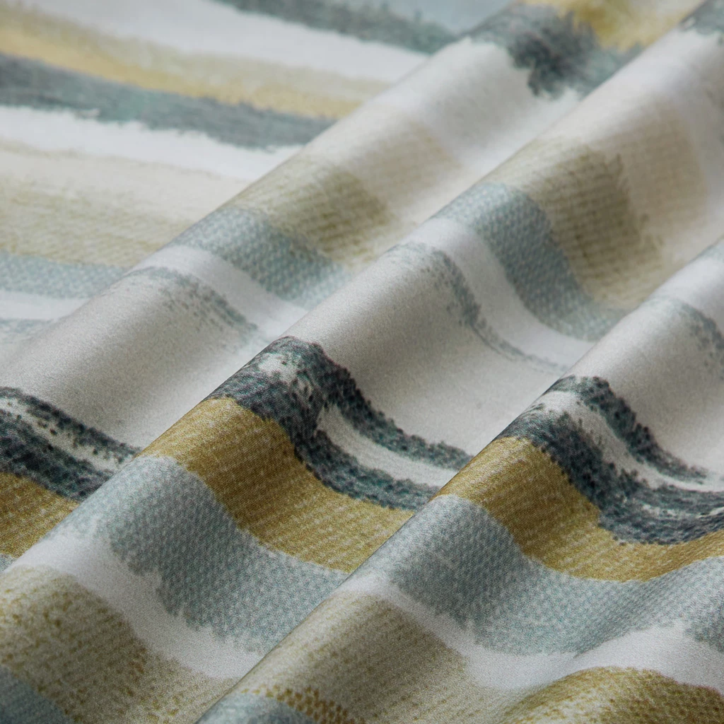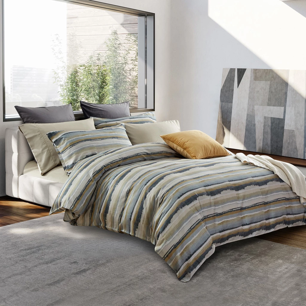 Our Stratum duvet cover and pillowcase set highlights a modern layered effect in hues of tan, grey and burnished gold. Reminiscent of a fall landscape, the tonal colors blend perfectly in horizontal bands. The set is woven in a 300 count, fine cotton for breath-ability and softness. The duvet cover is machine washable and dry-able. Zipper opening along one side. Interior corner ties ensure your duvet stays in place.
