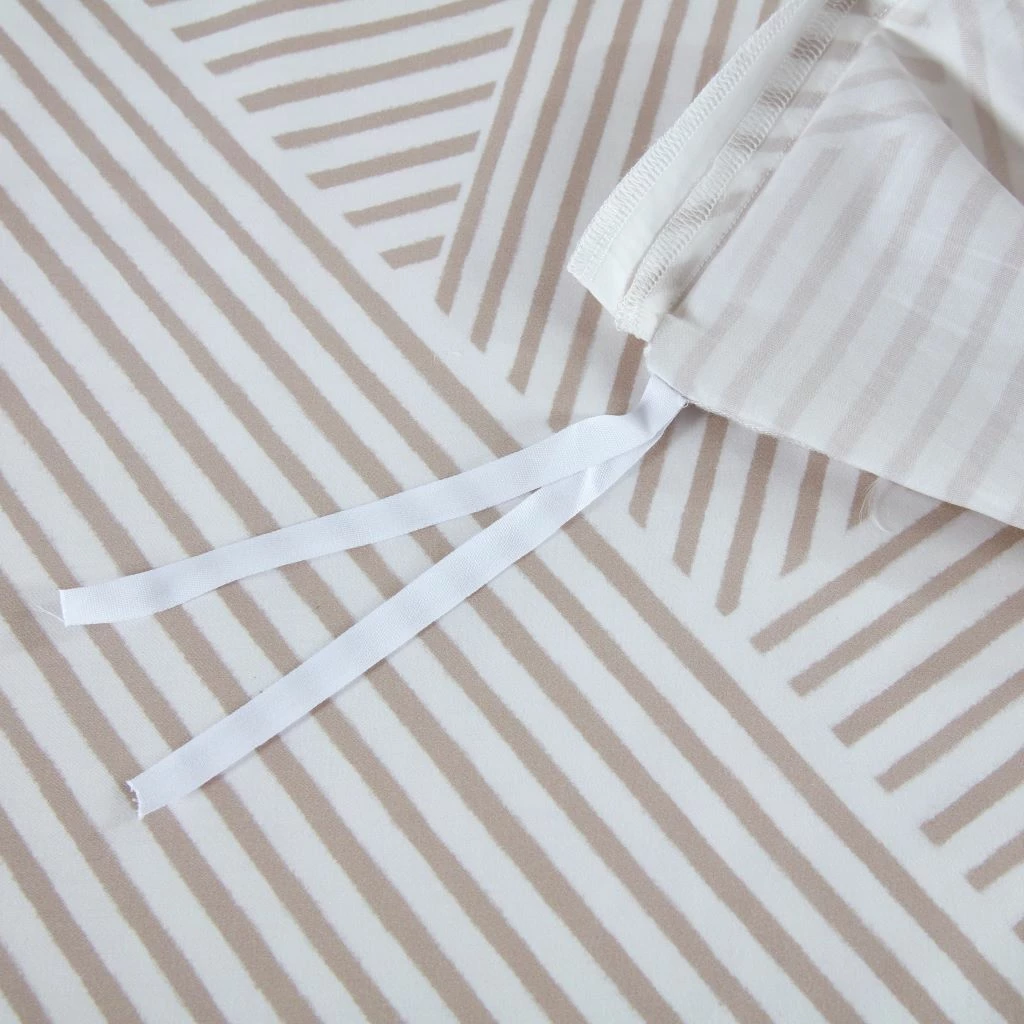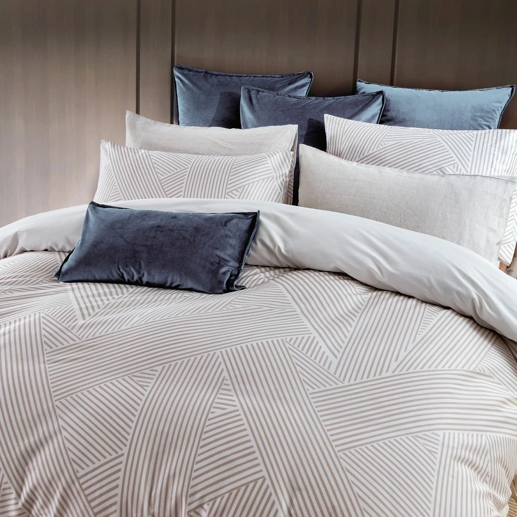 Vertex is a modern geometric design in tan on a cream ground and reversing to a solid cream. It is neutral in coloration while being fashion forward in its look. The duvet cover and pillowcase set is made from a 300 count combed cotton sateen for comfort and breathability. It is machine washable and dryable for ease of care. The cover has a long 60” hidden zipper opening along one side. The set is oversized to account for residual shrinkage.